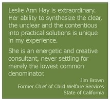 Leslie Ann has owned and operated Hay Consulting since 1997. Previously, she gained broad experience in operations management and technology consulting as a Senior Consultant in the human services practice of Deloitte and Touche, LLP. She was an Advisory Consultant to the California Child Welfare Services Improvement Plan and designed and delivered a training series to the Los Angeles Department of Children and Family services on Concurrent Planning for Managers, Supervisors and Social Workers. Leslie Ann was also Director of Family Services at Casey Family Programs.