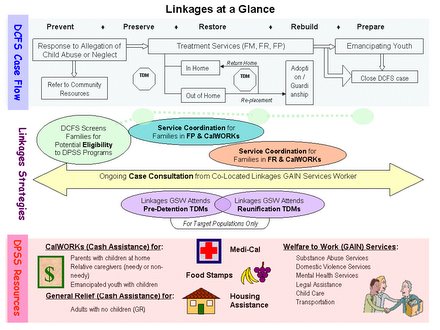 LINKAGES provides a bridge of strategies that enhance how families are served by DCFS and DPSS. Linkages features FIVE STRATEGIES to strengthen families, depicted in the center channel of the flow chart and described individually below.